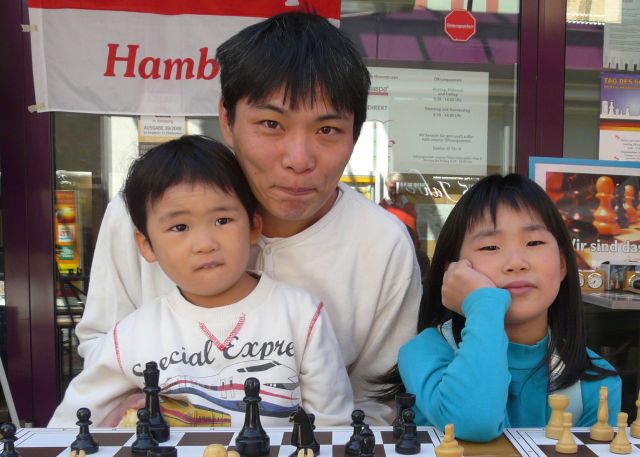Herr Shiro Hatsuse (gebürtiger Japaner) hier zusammen mit seinem Sohn Sota und Tochter Ayano am "Tag des Schachs" 28.August 2010 in den Elbgaupassagen...