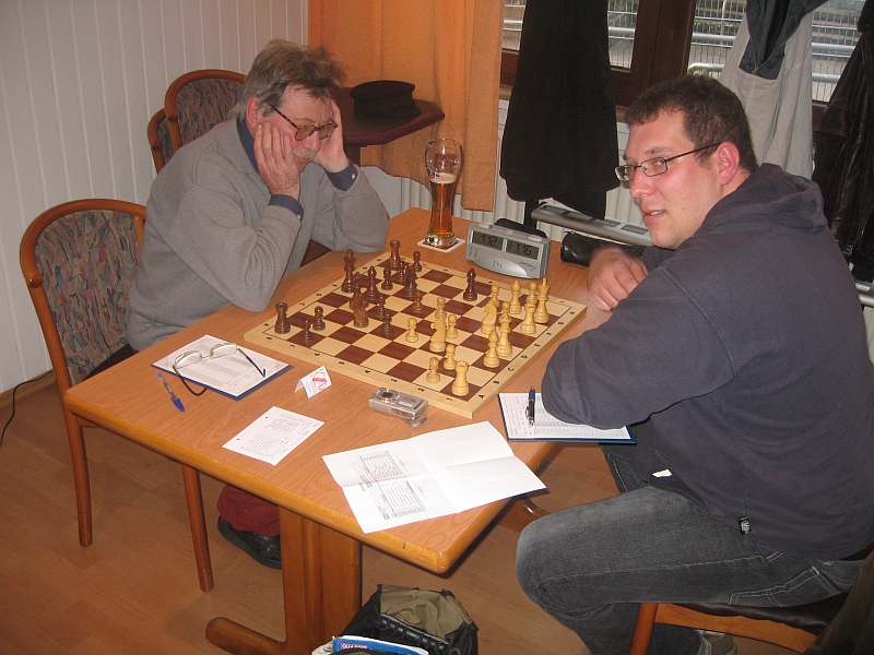 Klaus Kallabis schaute sich meine Stellung an Brett 1 an...rechts mein Gegner Frank Hänel, dem ein Figureneinsteller unterlief...